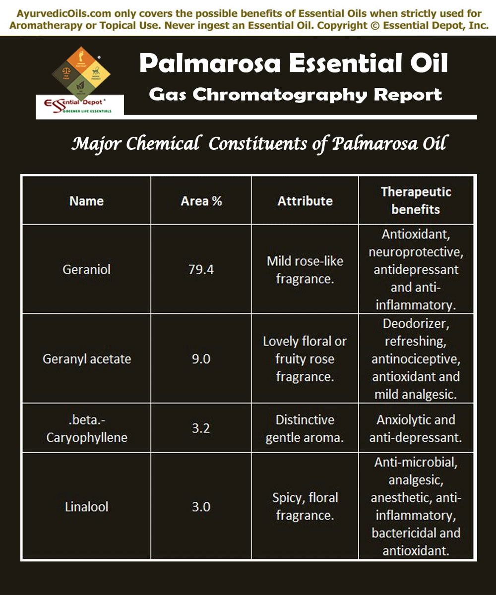 According to the Gas chromatography report, Geranium oil constitutes of 20 chemical components that contribute to its fragrance, therapeutic attributes, consistency and quality of this oil. Of which, Citronellol contributes to the highest proportion of Geranium oil with about 35.0% of its total composition.